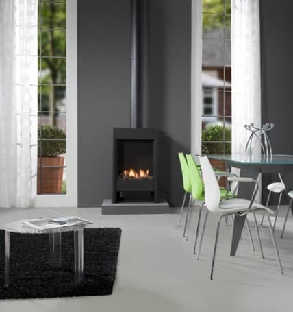 Moderne vrijstaande 3-zijdige hanghaard in zwart gietijzer.